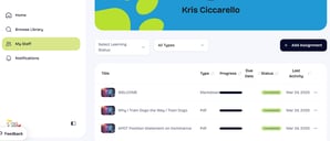 A progress bar on your course page will show 100% when all lessons are complete. You may also receive a completion badge or certificate if one is included. Your completed course will now show #/# of items completed and also be removed from “Continue Learning”. For owners, you are able to view My Staff > Progress.